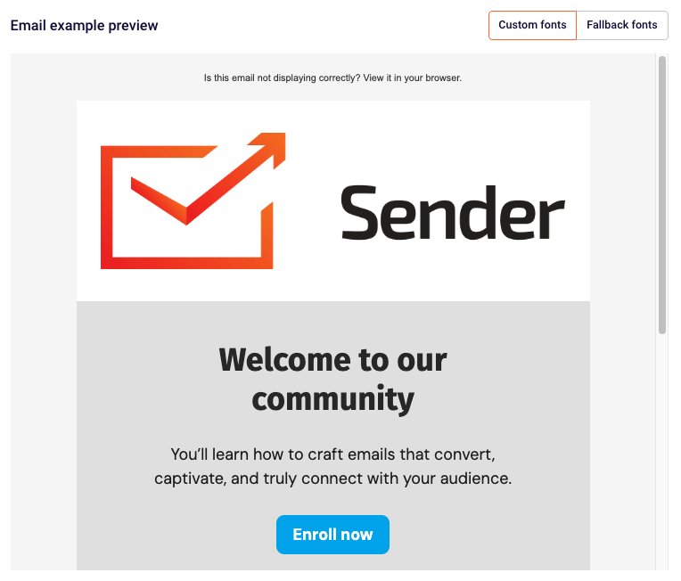 - Toggle between “Custom fonts” and “Fallback fonts” to see how your emails will render in different email clients.