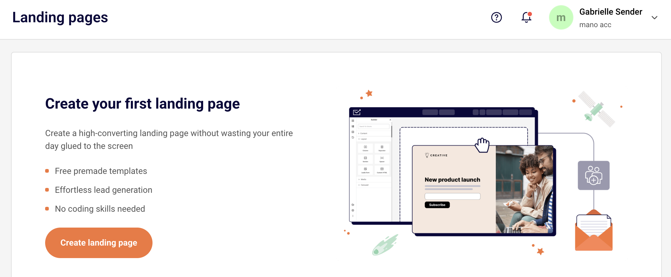 To create a landing page, head to Click “Landing pages” from the menu on the left and then “Create landing page”.