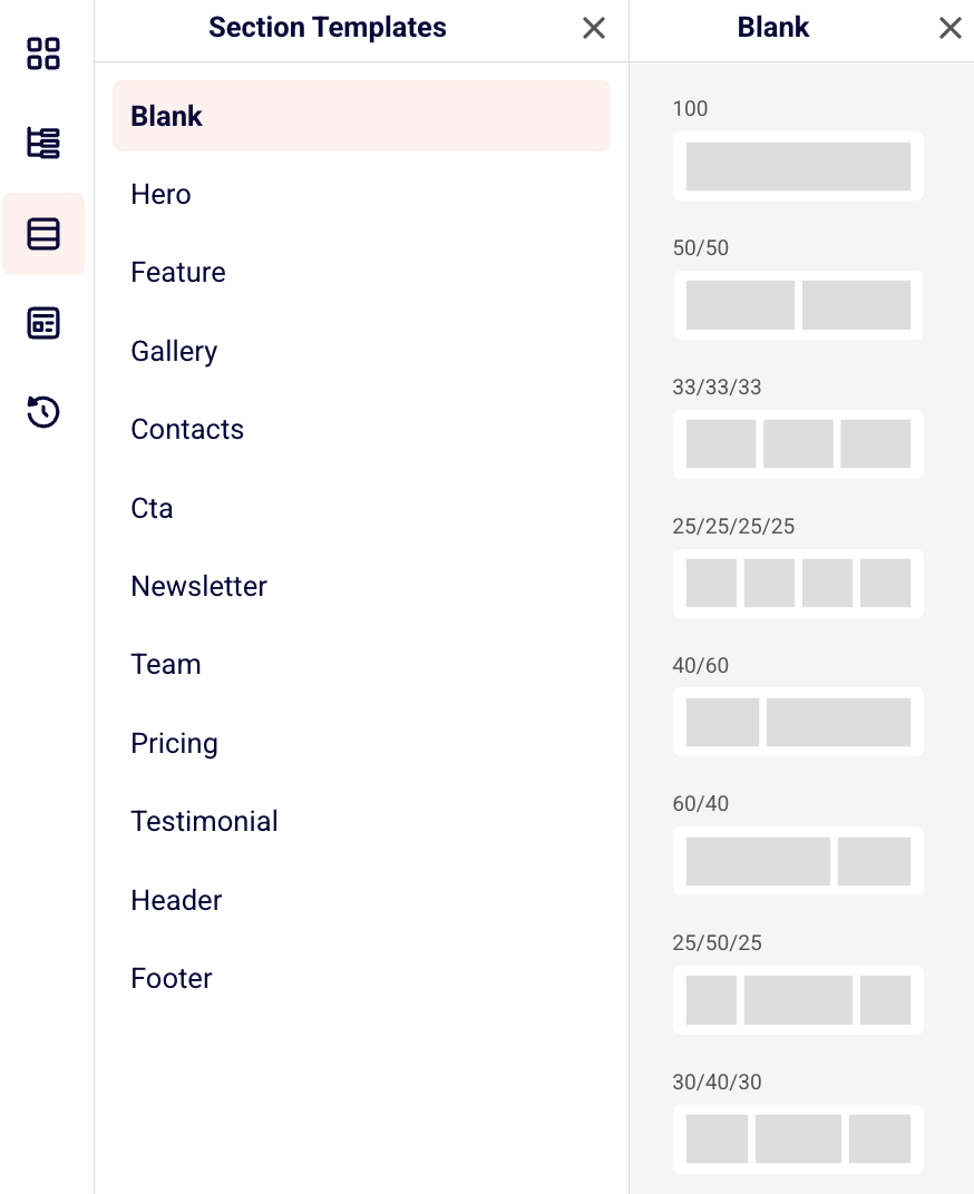 There is a variety of pre-designed section templates to help you create your landing page quickly and easily: from impactful hero sections, organized feature displays, to compelling call-to-action areas, you can choose from multiple template options for each section type.