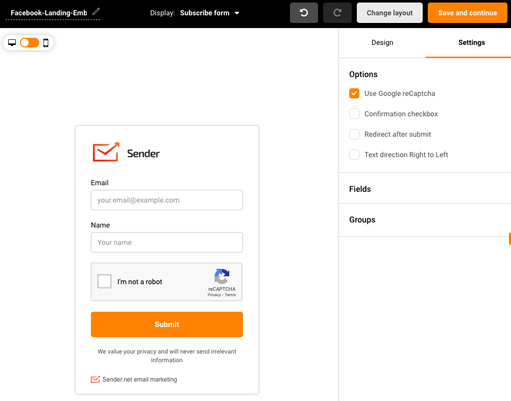 Now you shall be looking at the main screen of the form editor where you can affect everything from look & feel all the way to advanced settings such as GDPR confirmation checkbox and reCaptcha for spam protection.