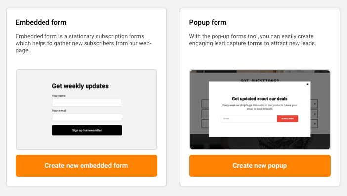 In order to create a popup form click “Forms” in the main menu bar. Then click “Create a new form” and you will be presented with different form options: