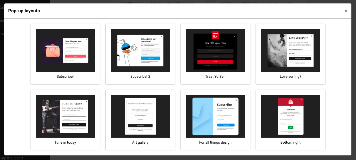 Creating a popup form is an easy process. Once you click on “Create new popup”, you will have a few templates to choose from. Pick one and click on it. You will have an option to change the layout at the design editor if you change your mind.