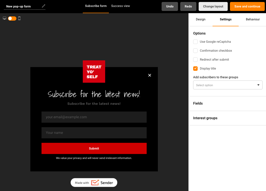 In this case, we picked “treat yo self” template – editing the popup form is practically the same process as creating an embedded form. It has the same design options and general settings. Click here for a tutorial on these options.