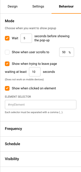 In the Behaviour section, you can set up when you want your pop-up to appear on your website.