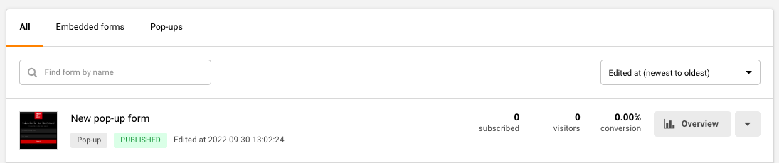 You can access the form’s activity panel by clicking on the “Overview” button in the “Forms” section.