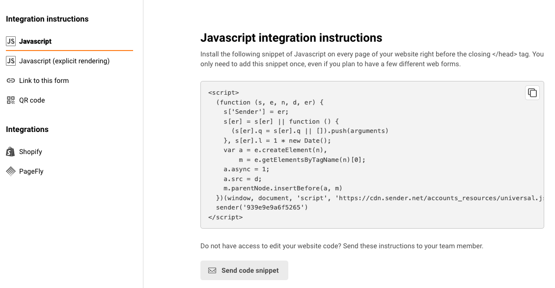 After the subscription form is fully designed – click the “Save and continue” button on the top right side. After that, you will be taken to the final tab. Here you will find the form’s script, which must be embedded into your web page.