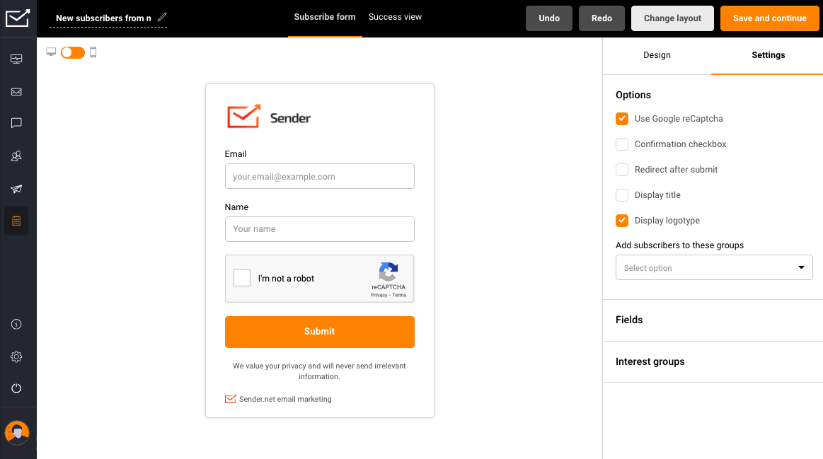 Creating an embedded form is a simple process. Firstly, you will need to set up the design. The subscription form is fully customizable – each element can be changed and modified according to your needs. Furthermore, the subscription form can have additional pieces like reCaptcha for security, a confirmation checkbox for GDRP requirements, and other options.