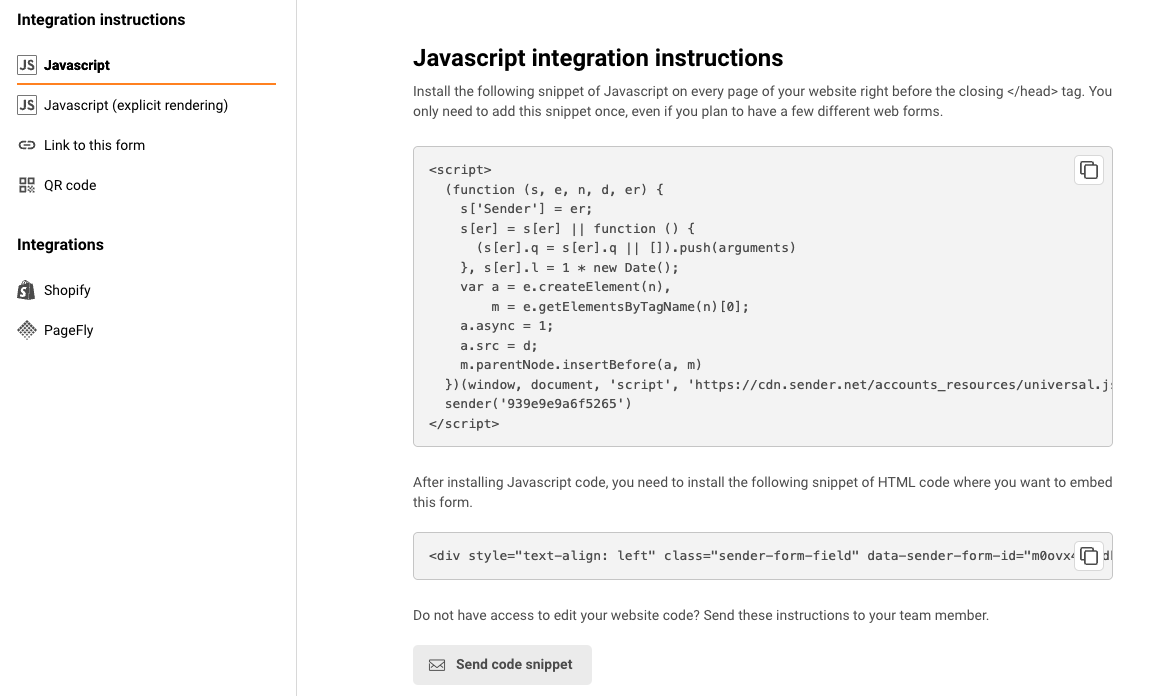 After the subscription form is fully designed – click the “Save and continue” button at the top right side. After that, you will reach the final tab. There you will find the form’s script (the embedded forms have two script parts), which must be embedded into your web page.