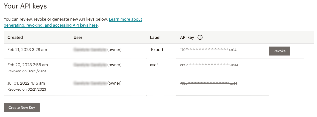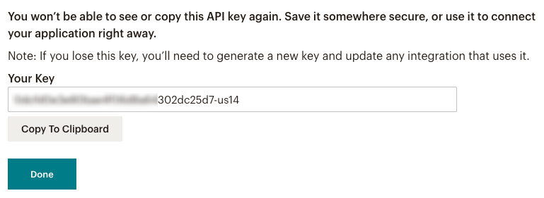 After creating and naming your new API code, you will be able to copy the full code and use it to export your subscribers from Mailchimp.