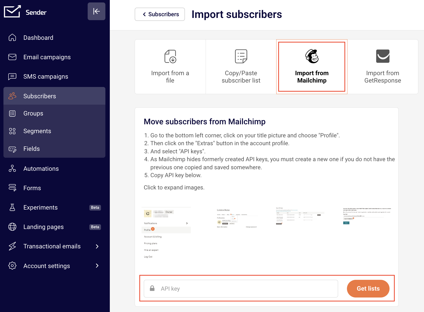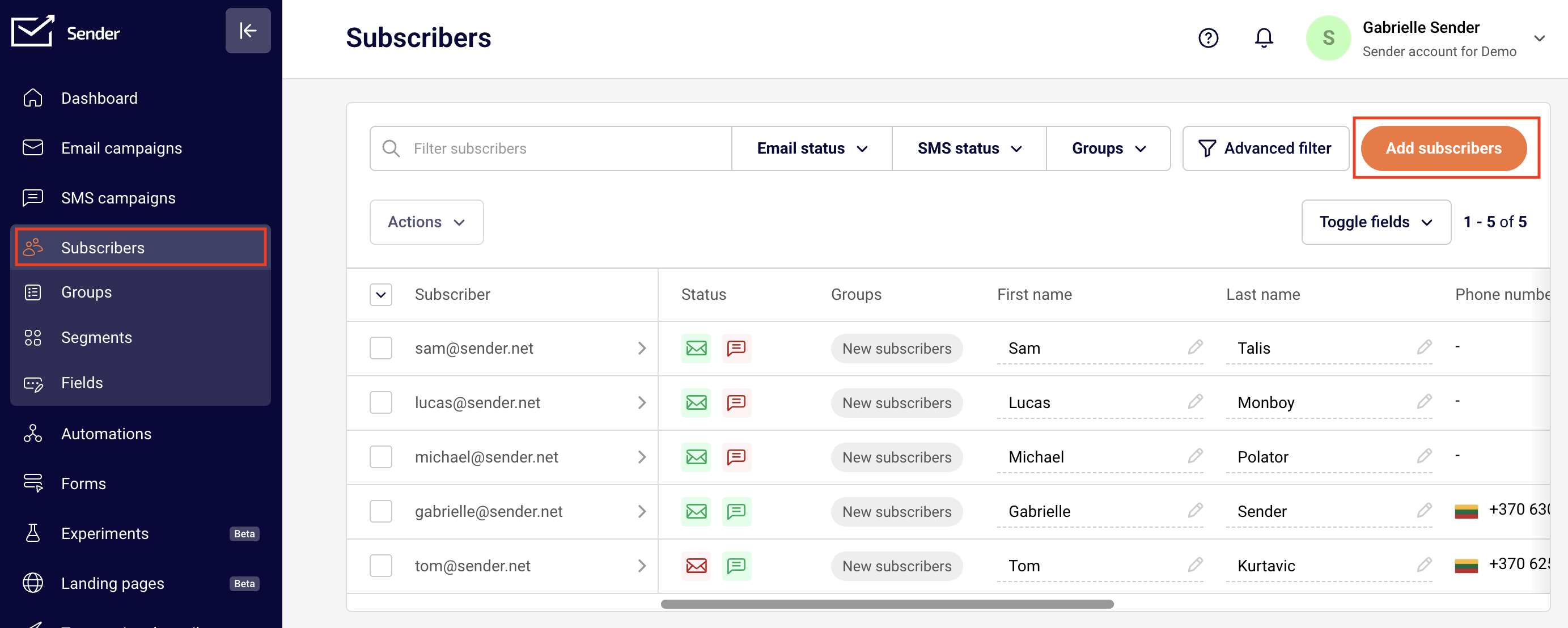 First of all, to transfer subscribers from Mailchimp to Sender, you will need to open the Sender dashboard and head to the Subscribers section. Then click “Add subscribers”.