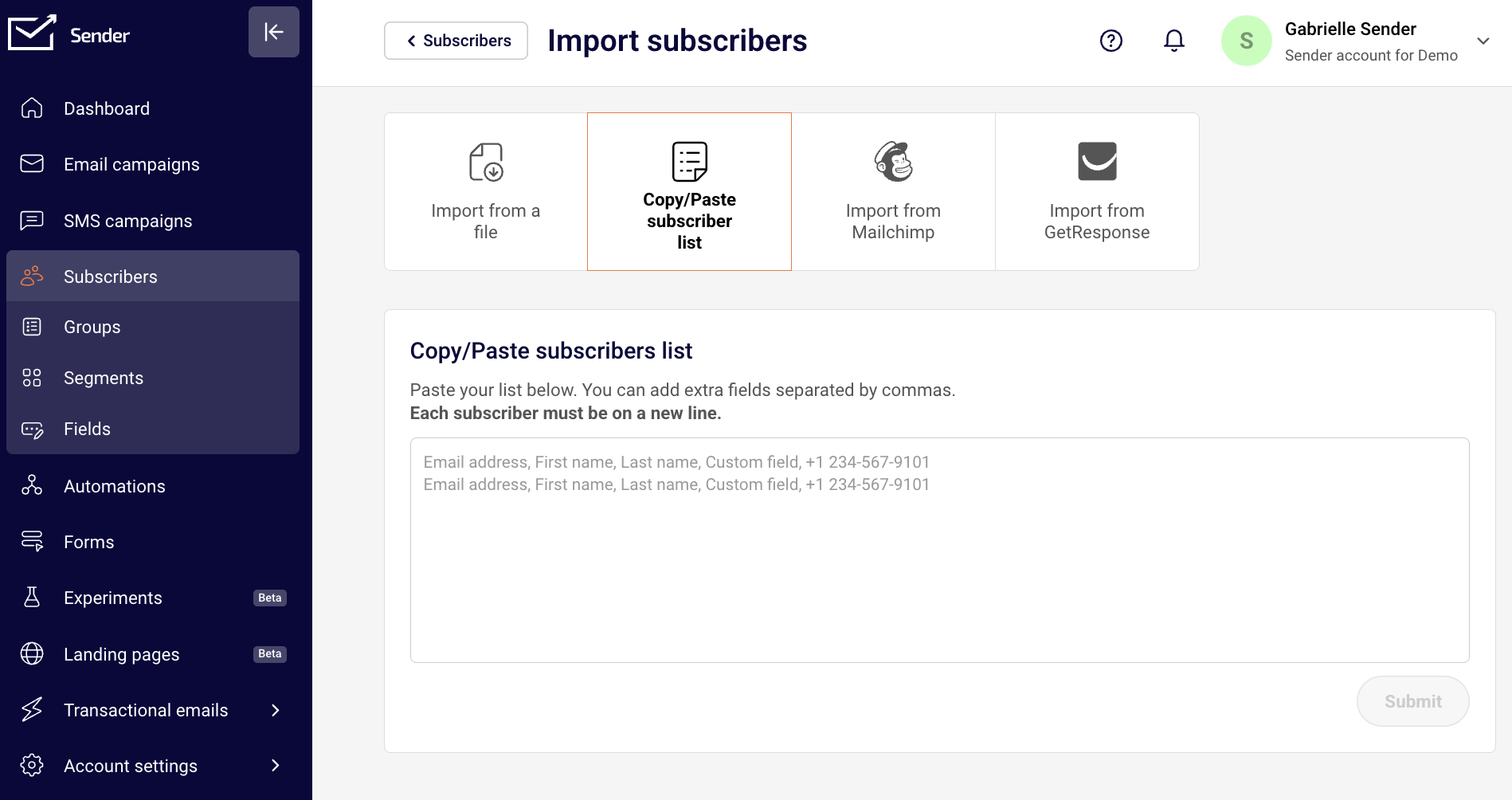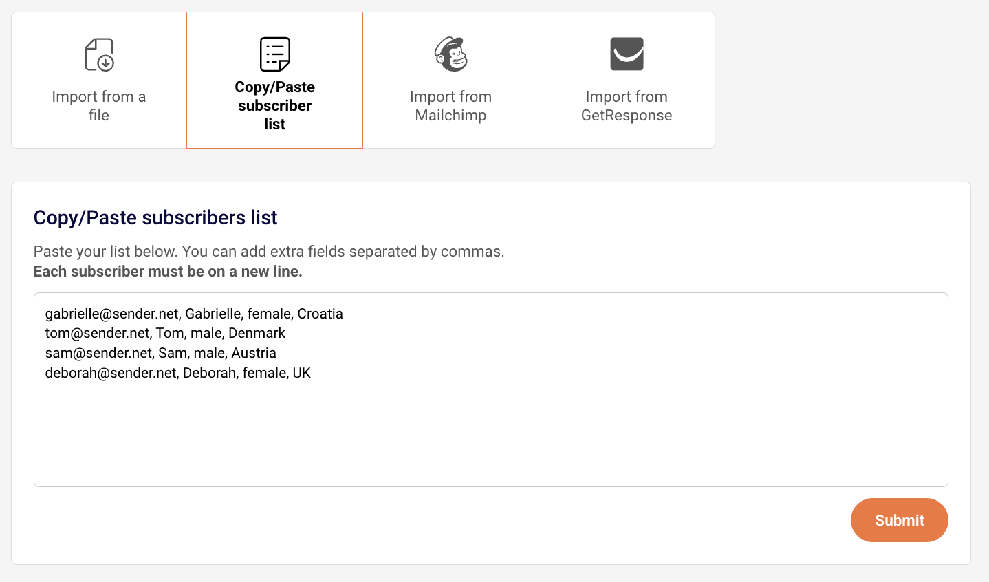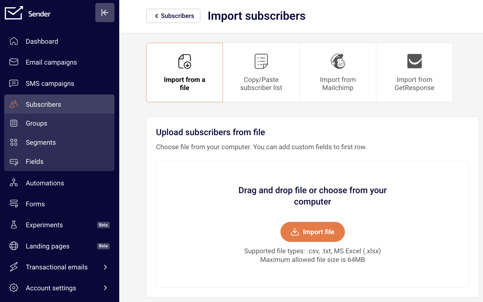 If you prefer to upload your subscriber list directly, Sender supports multiple file formats.