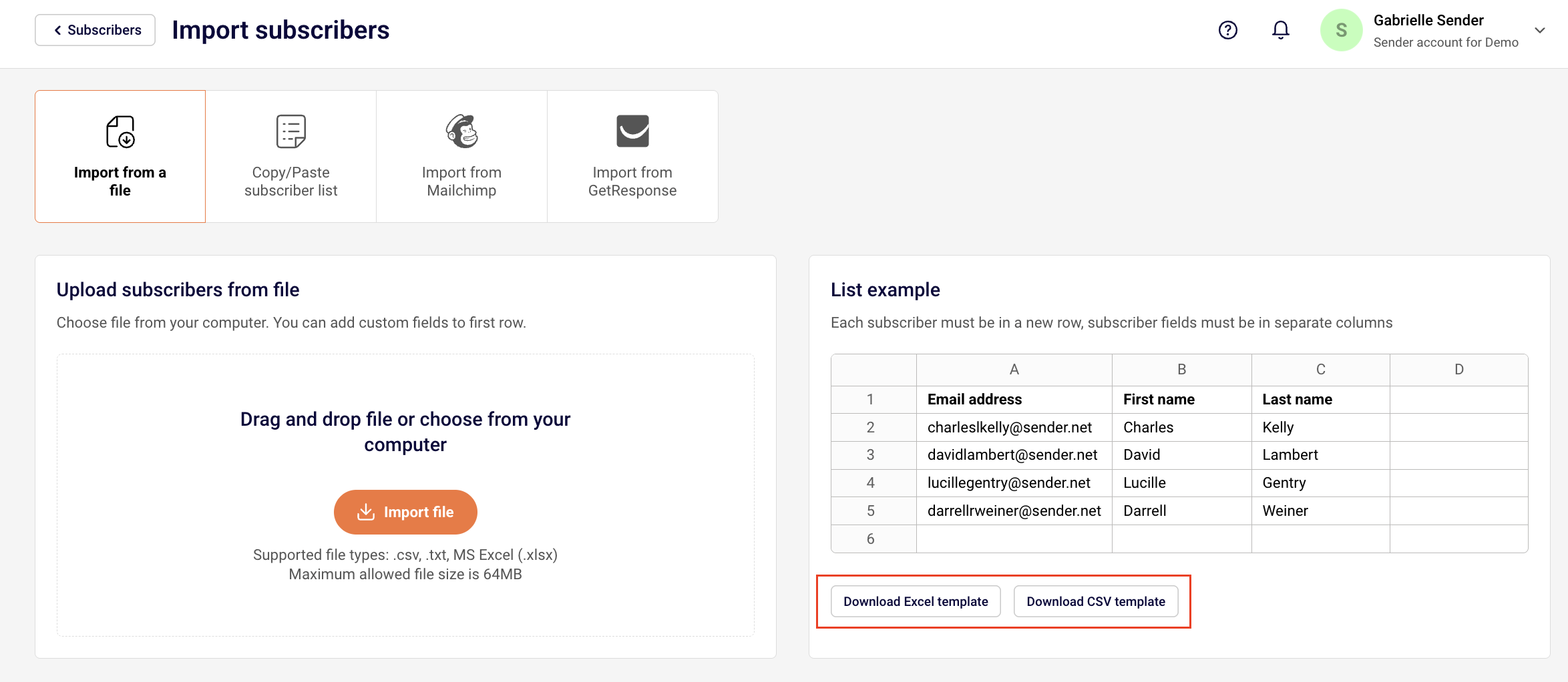 If your subscribers are in another type of file and you need a clean template to add all of your subscribers before import, we provide a downloadable Excel and CSV templates.