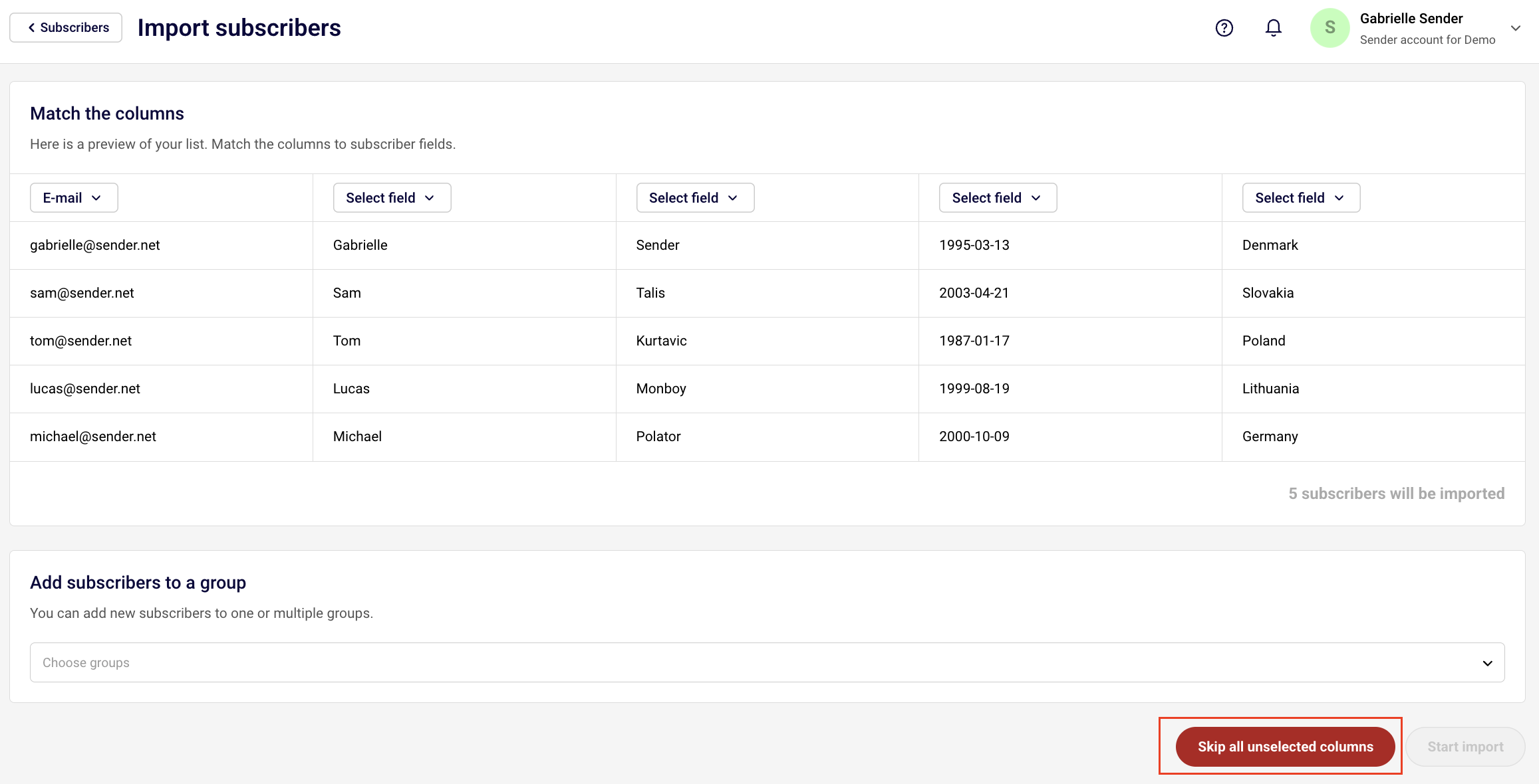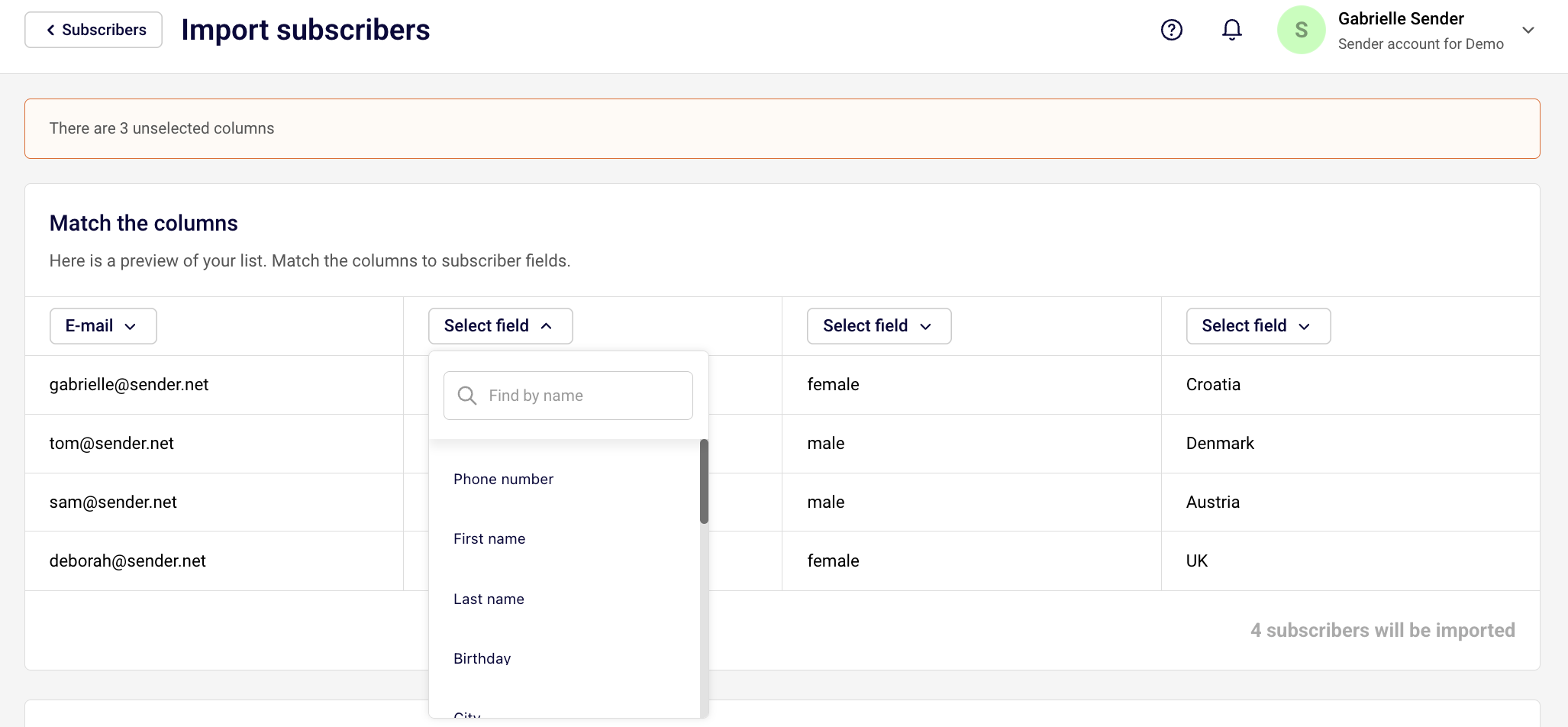 After uploading your file or pasting your subscribers, you’ll need to map your columns to Sender’s custom fields: