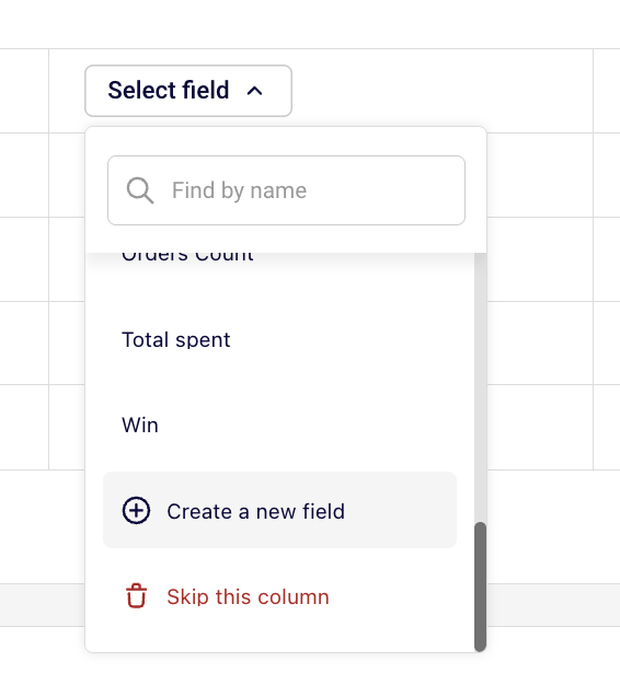If you do not have a custom field for a particular column of data, you can create one by clicking “Create a new field” at the bottom of the drop-down bar or skip the collumn all together if you don’t need that information imported.