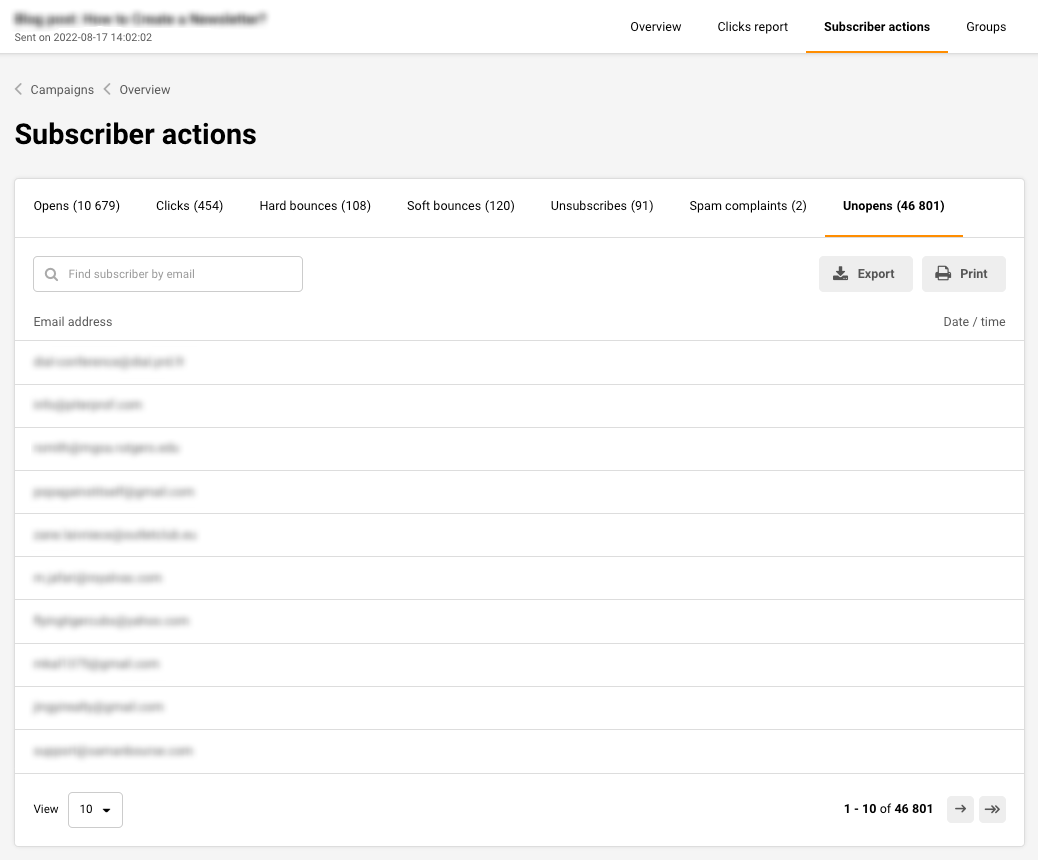 Of course, the easiest way to do that is by going to the Campaigns section and clicking on the “View Reports’ button. Then you will be taken to the reports section, next click on “Subscriber actions” and select the “Unopened” tab.