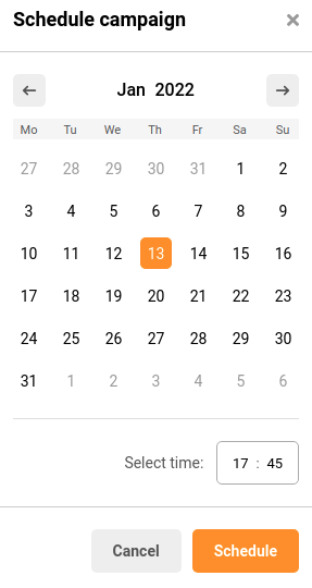 When the schedule button is clicked, a calendar appears, where a date and time can be picked for when the SMS should be delivered.