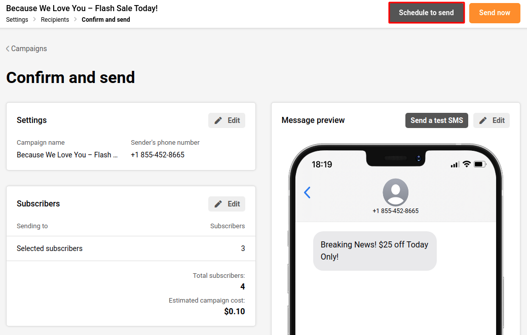 The SMS campaign scheduling option appears at the last step of the campaign creation. Once everything with the SMS campaign is done, click on the “Save & Continue” button, select your desired subscriber list, click continue to get into the final step.