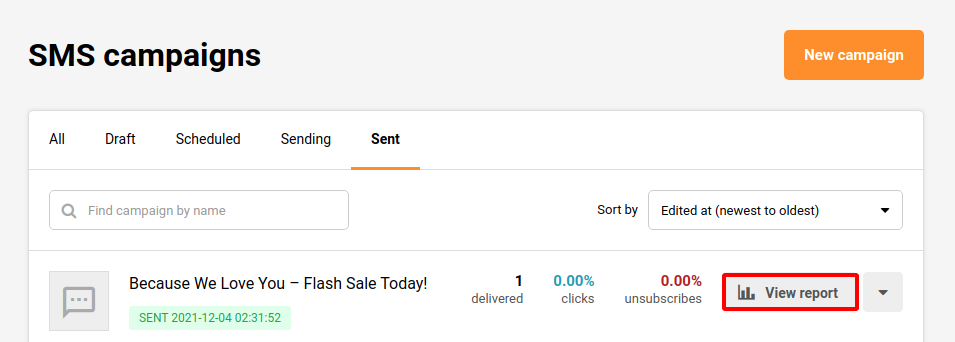 The SMS campaign report is located behind the “View report” button on the SMS campaign section: