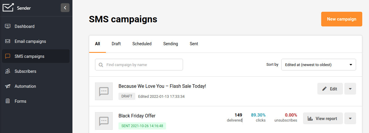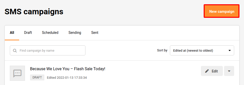 Once the SMS campaign section is opened, the campaign library can be accessed. It contains scheduled, sending and sent campaigns as well as their drafts.