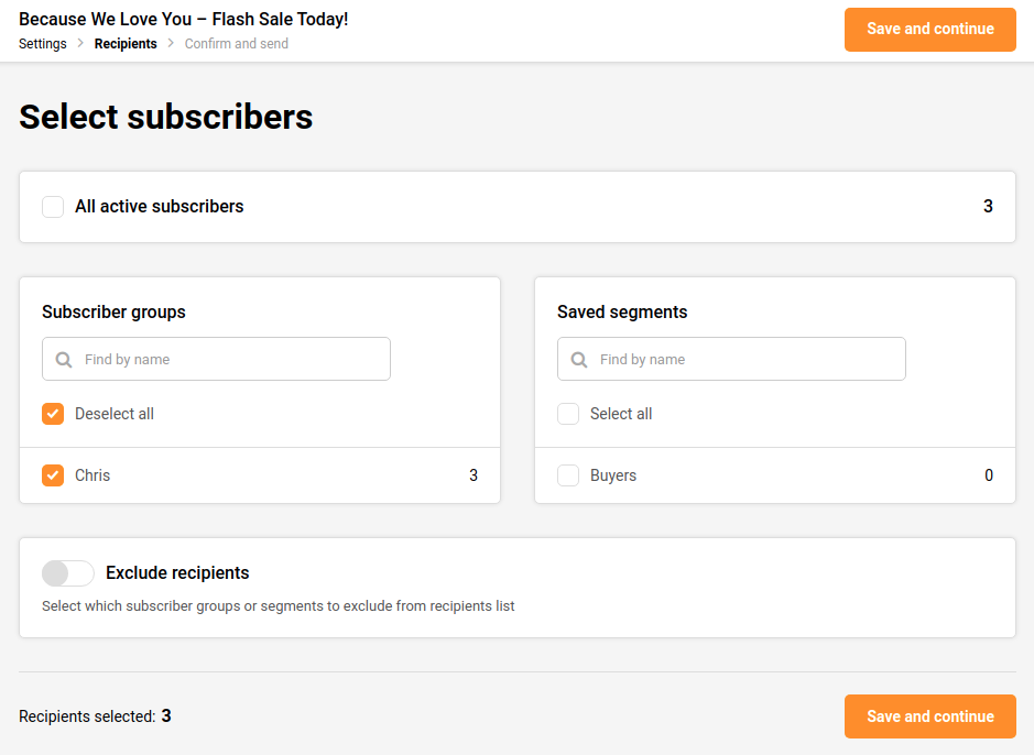 Once everything is completed in the Settings stage, the “Save and continue” button needs to be clicked to save the progress and move to the next stage – Recipients. Here recipients can be selected by choosing specific Groups or Segments that have been created: