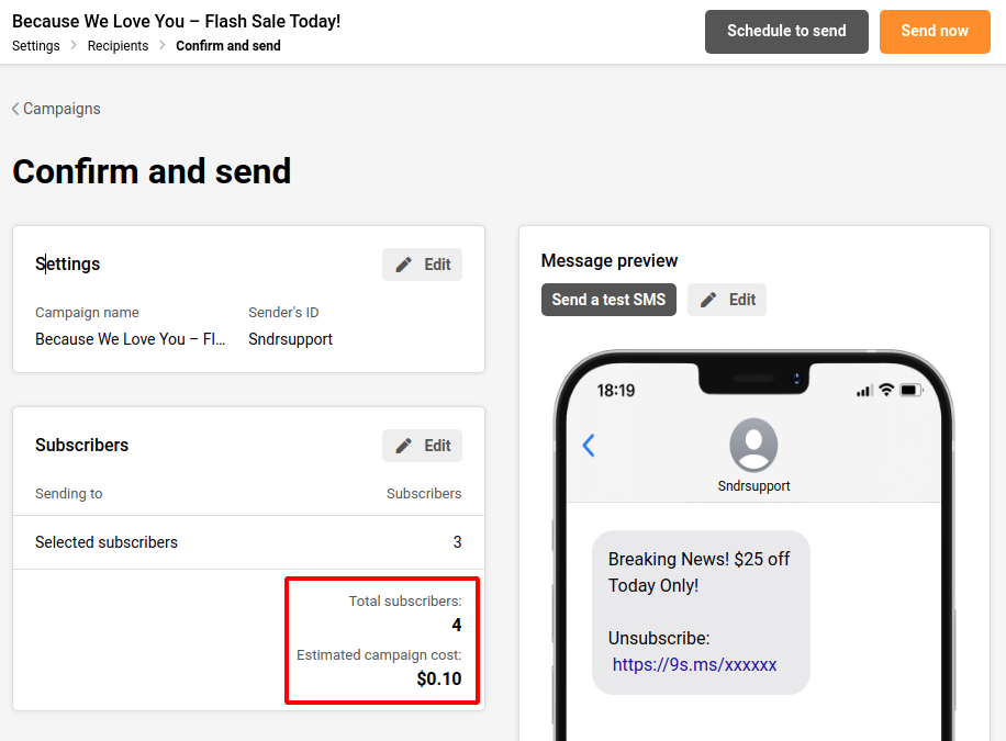 After the recipients (subscribers) are selected, the last thing that is left is to “Confirm and send”. Here the estimated cost of the campaign is displayed together with the total number of subscribers that has been selected and the settings that have been set: