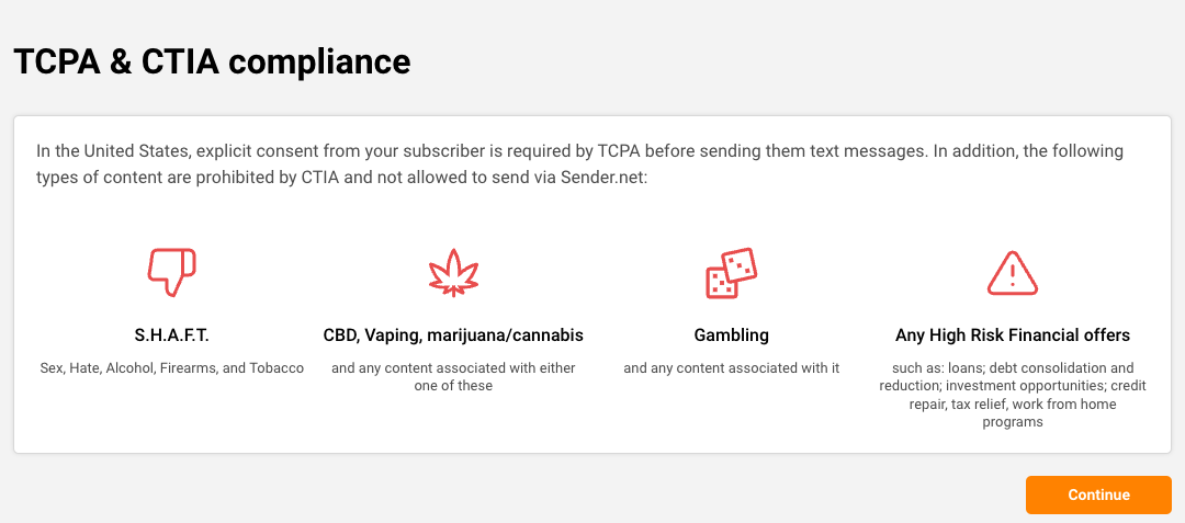 In the first step will be reminded of the content that is not allowed to be sent via Sender.net. Double-check if none of it applies to you. If it doesn’t then click “Continue”.