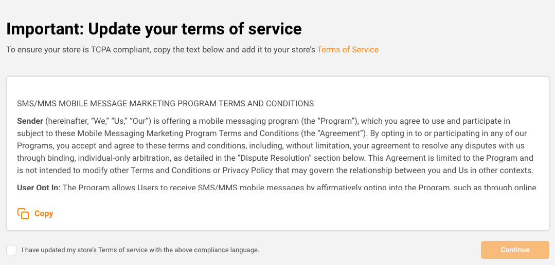 The next step is for you to update your website’s/store’s Terms of Service (TOS). Copy the text below and add it to your website’s TOS.