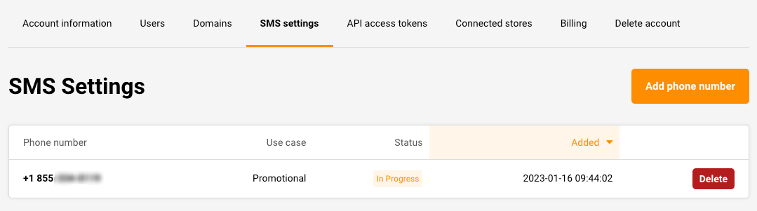 Once you fill in all the required information, submit the form, and you will see the status of the phone number set to “In progress”.