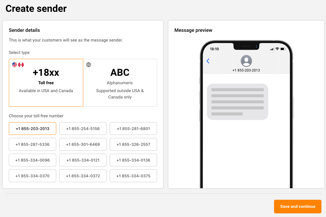Then choose the “Toll-free” type, select a number from the list and click “Save and continue”.