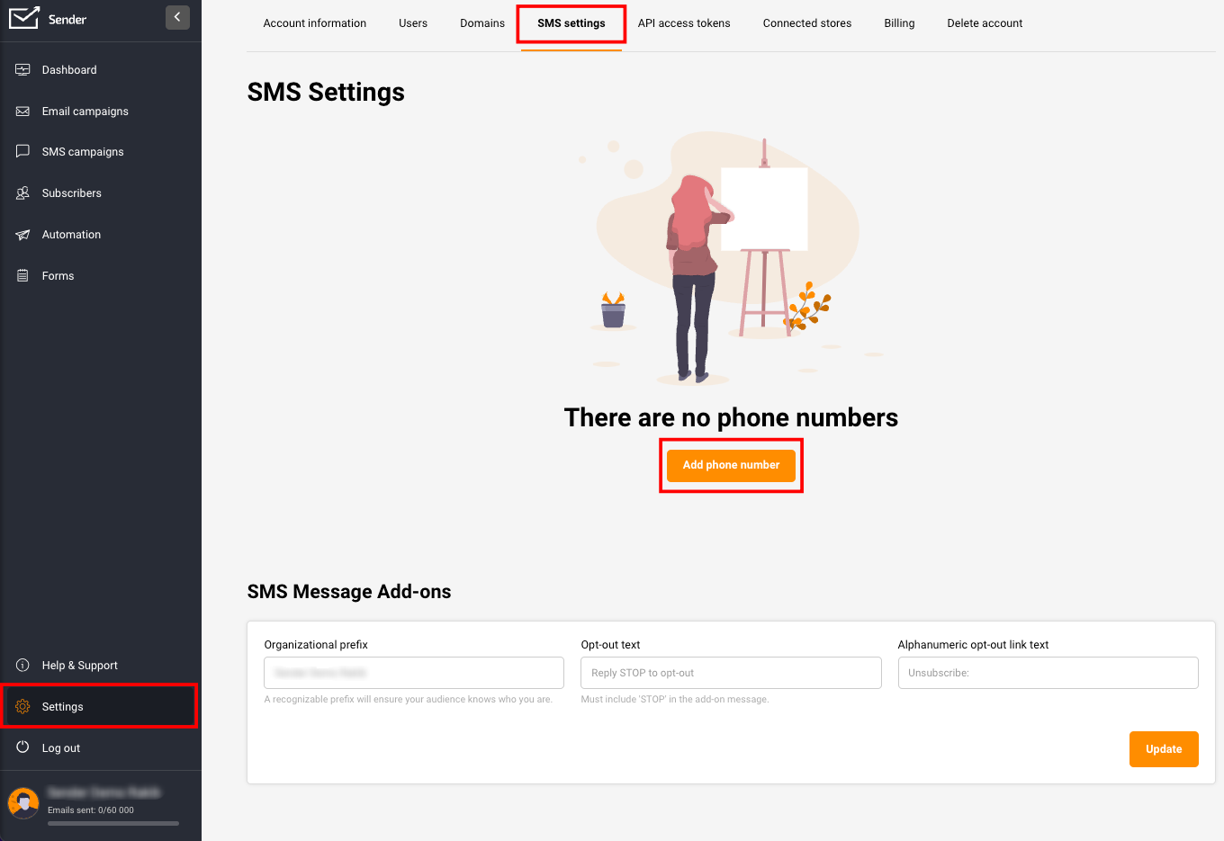 Go to Settings -> SMS settings and click “Add phone number”.