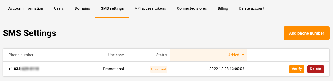 Your chosen toll-free number will now appear in your SMS settings list with “unverified” status.