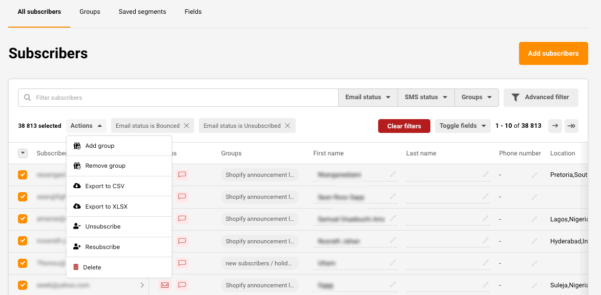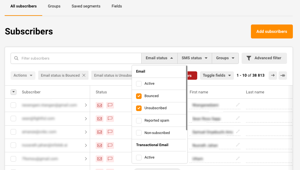 If you need to delete the unsubscribed or bounced email addresses, you can do that with a few clicks. First, go to the subscriber’s section, then click on “Status” button and select “unsubscribed” or “bounced” when the option is selected, you will be presented with all unsubscribed and/or bounced recipients.