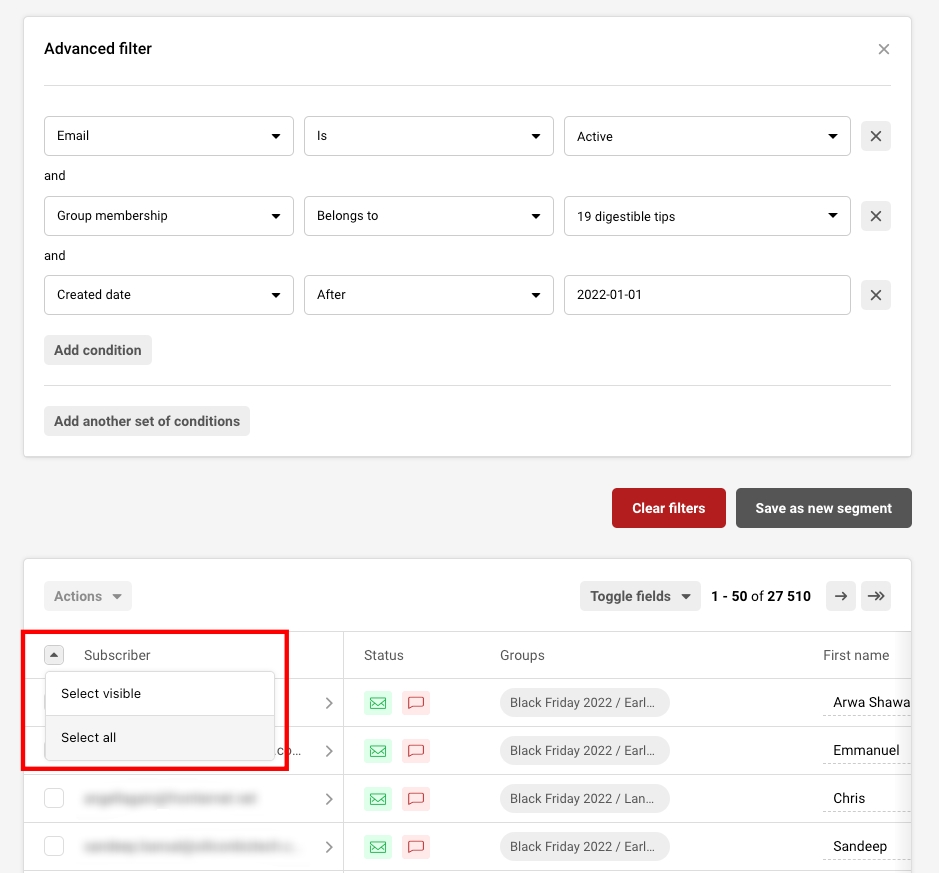 Once you select all the conditions, the system will filter the subscribers that match them. Then click the arrow at the top of the subscriber list and click “Select all”.