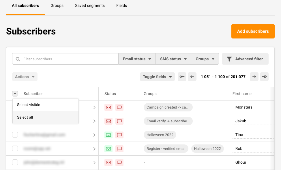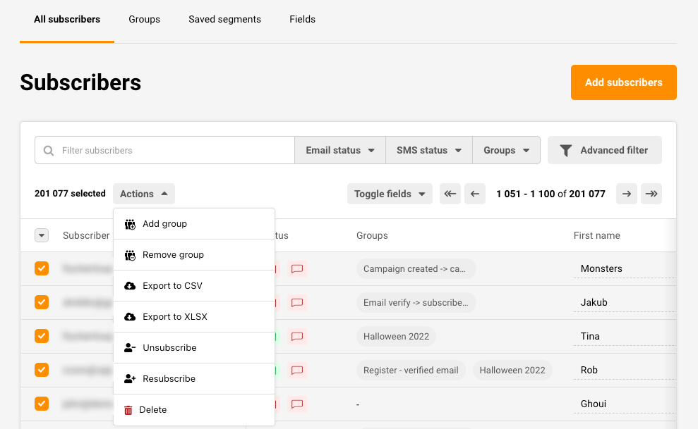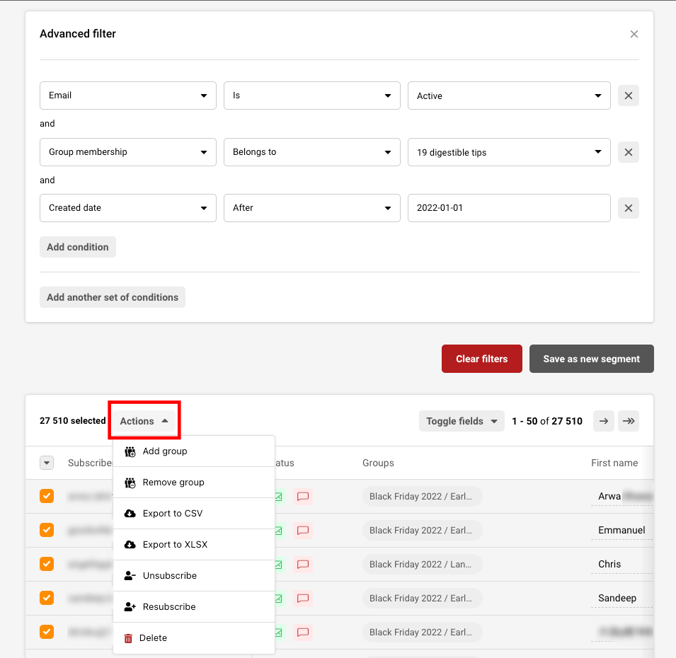 If you want to export a particular set of subscribers, you must filter them according to your needs, such as their email/sms status, group membership, campaign activity, etc. You can accomplish that by using the Advanced filter—more on that here.