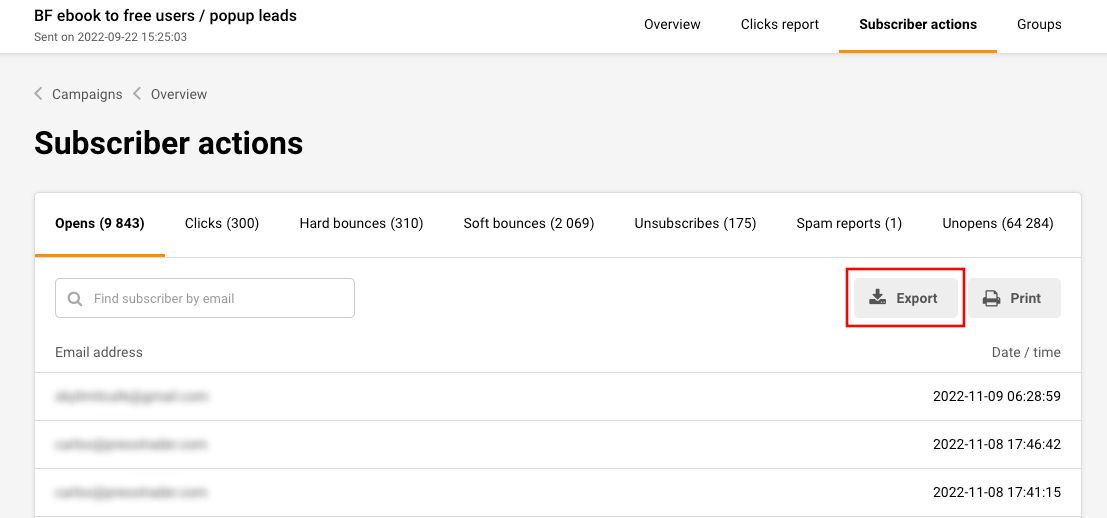 Now pick the tab that you want to export the subscribers from (e.g. opens, clicks, unsubscribe and etc.) and click “Export”.