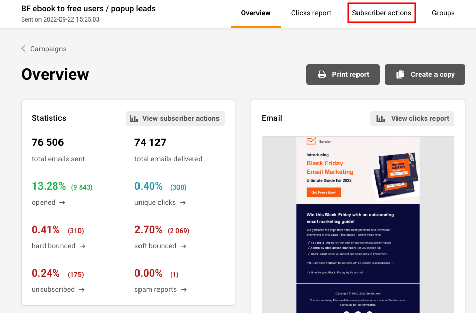 Go to “Email campaigns” and click “View Report” next to the required campaign. Then click “Subscriber actions”.