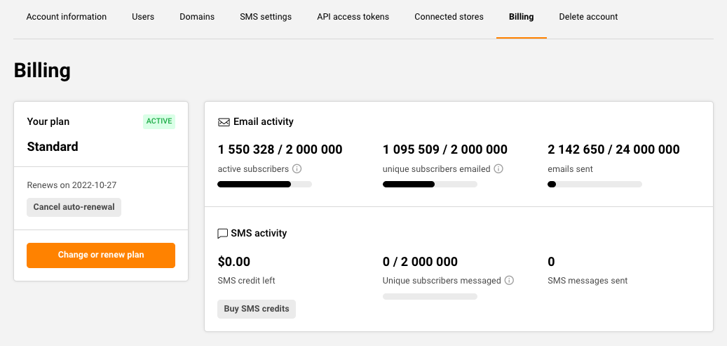 Another place where unique and active subscribers can be found is the billing section. Simply go to Settings -> Billing.