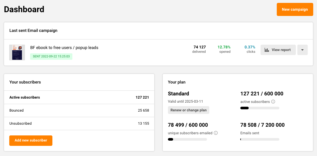 The dashboard section holds several shortcuts. The subscription plan counters’ block is one of them. There is also a table with active subscribers, unique subscribers, and sent email counts.