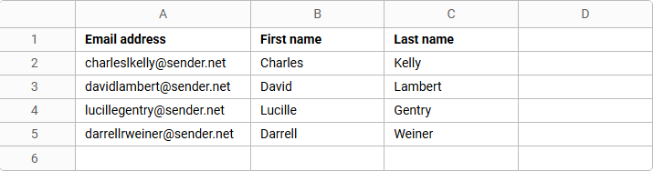 - Headers in the first row – Email address, First name, Last name