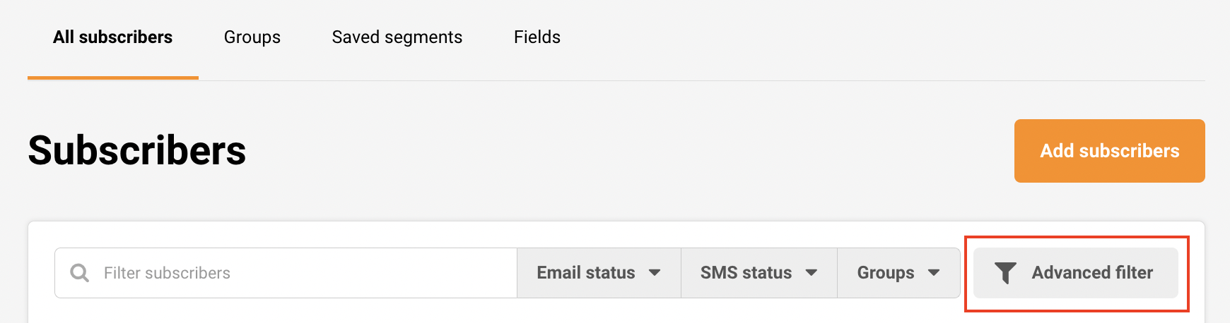 Now you’re presented with different filtration options. Subscribers can be segmented by various conditions, including subscription status, subscriber details, campaign activity, SMS campaign activity, ecommerce metrics, abandoned cart, and fields.