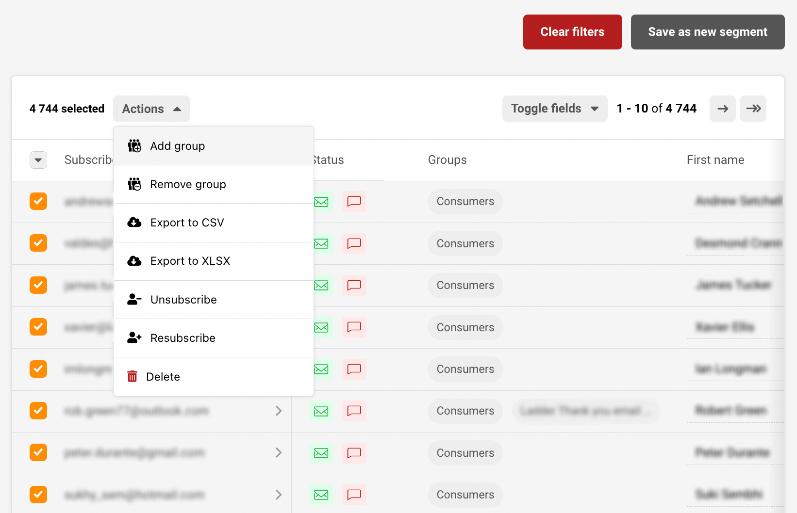 After subscribers are filtered out – you can execute different actions. Divided recipients can be attached or removed from a particular group, marked as unsubscribed, deleted, exported, and saved as a segment.