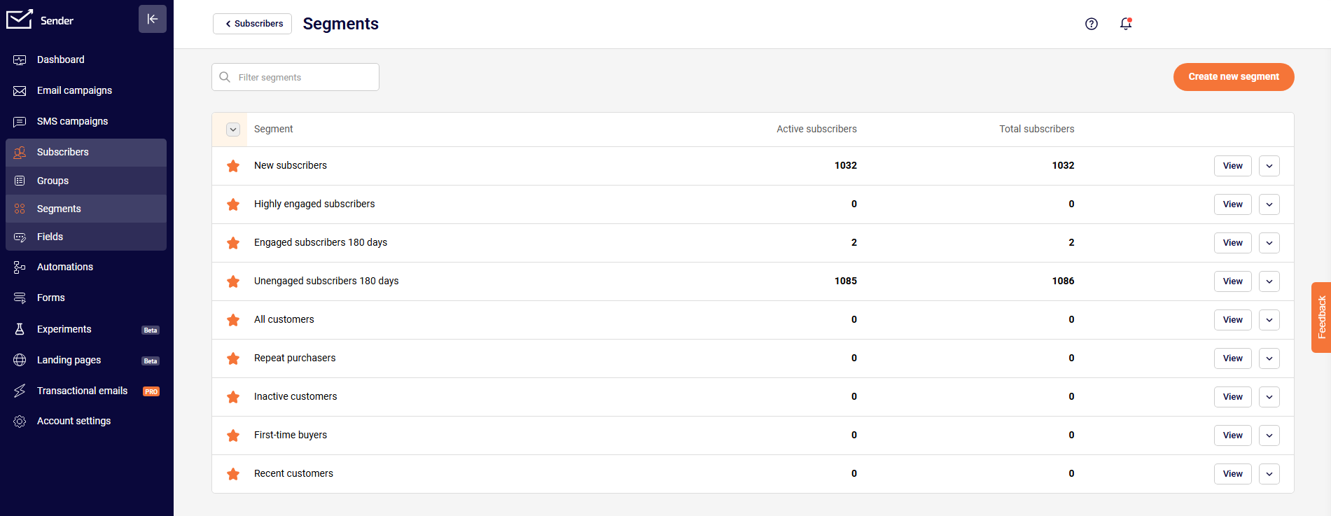 Learn about the Segments page in Sender and how to navigate its features for creating and managing contact segments.