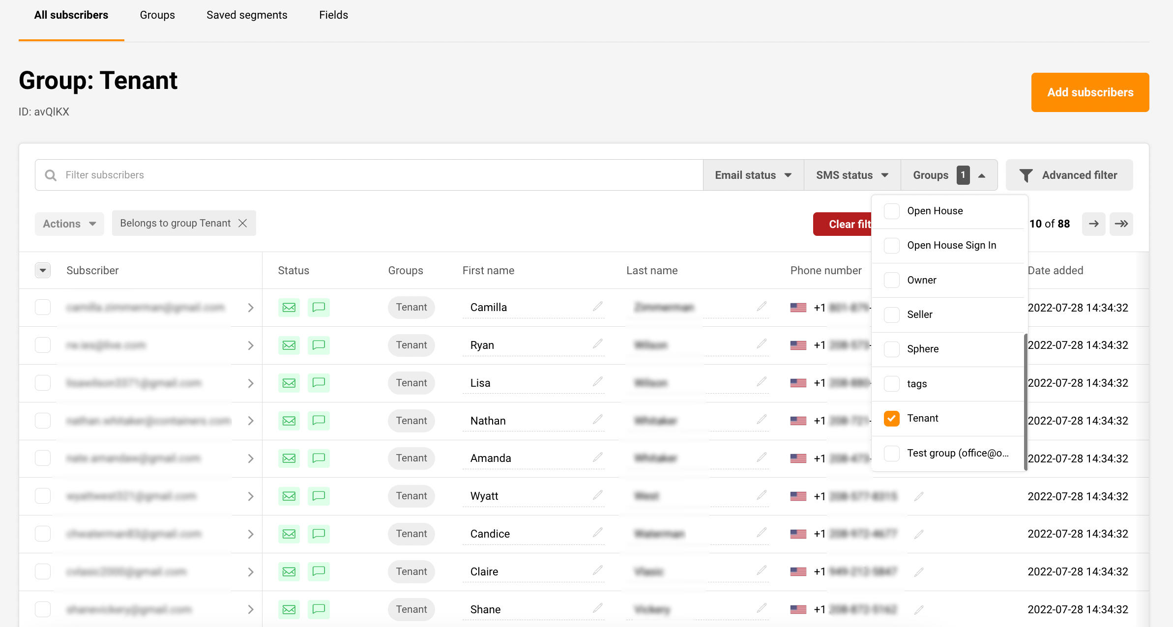 If you look closely, you can see that the group called “Tenant” is selected. When you choose a particular group, all recipients that belong to it will be displayed. You can select multiple groups; subscribers who belong to all picked groups will be filtered out.
