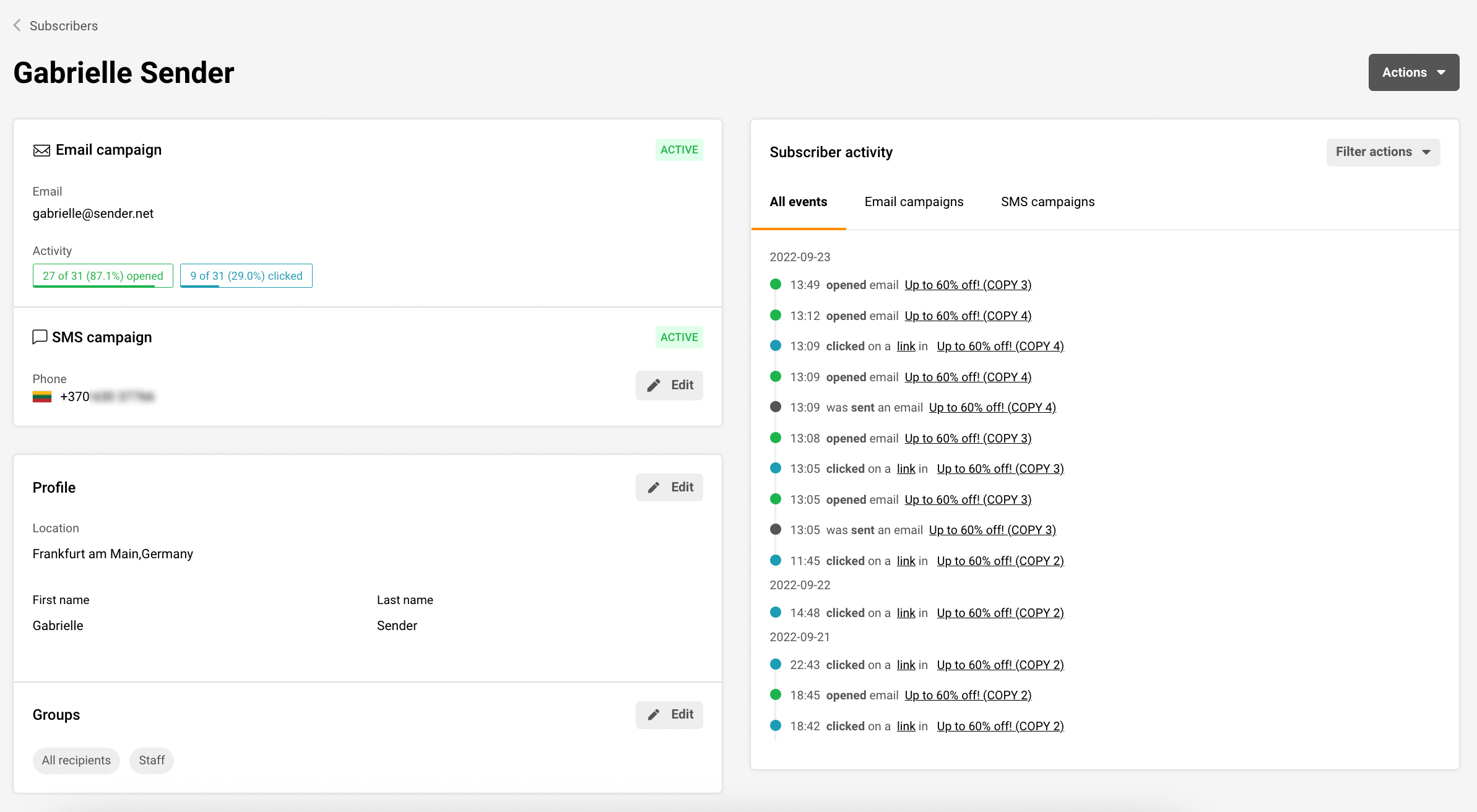All subscribers tab is the main section for managing subscribers. Here you can find all the essential tools: advanced filter, subscribers statuses, assigned groups, etc.
