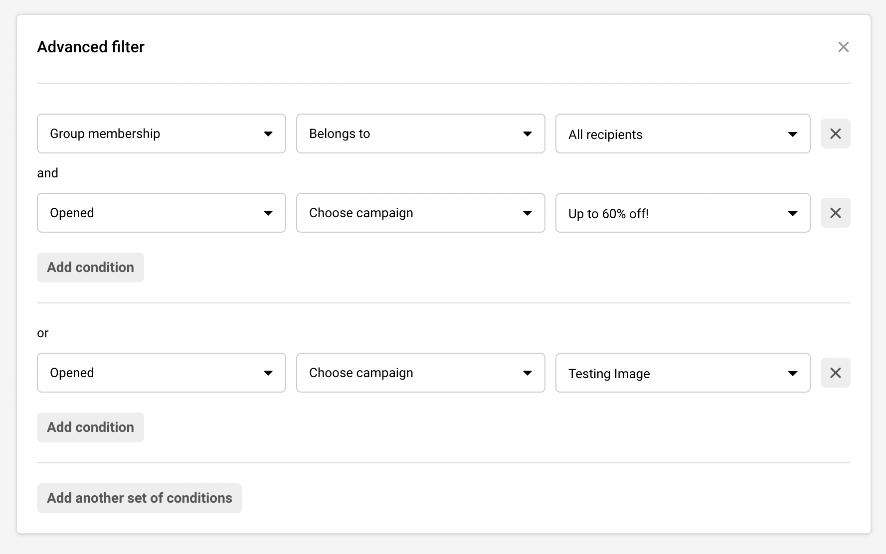 Furthermore, if you’re looking for a precise segmentation, you can add multiple sets of conditions. Subscribers that match all conditions/rules will be presented below.