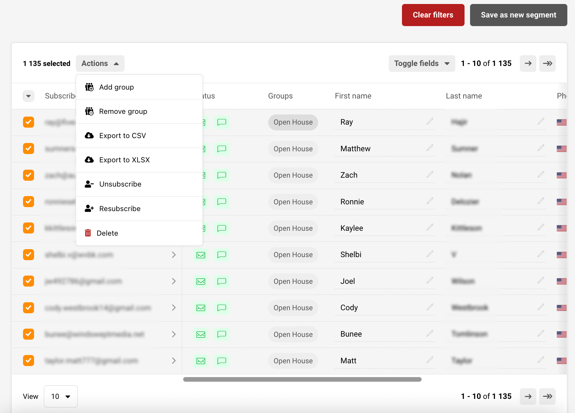 After subscribers are sorted out – you can execute different actions. Subscribers can be added or removed from a particular group, resubscribed, marked as unsubscribed, deleted, exported, and saved as a segment.