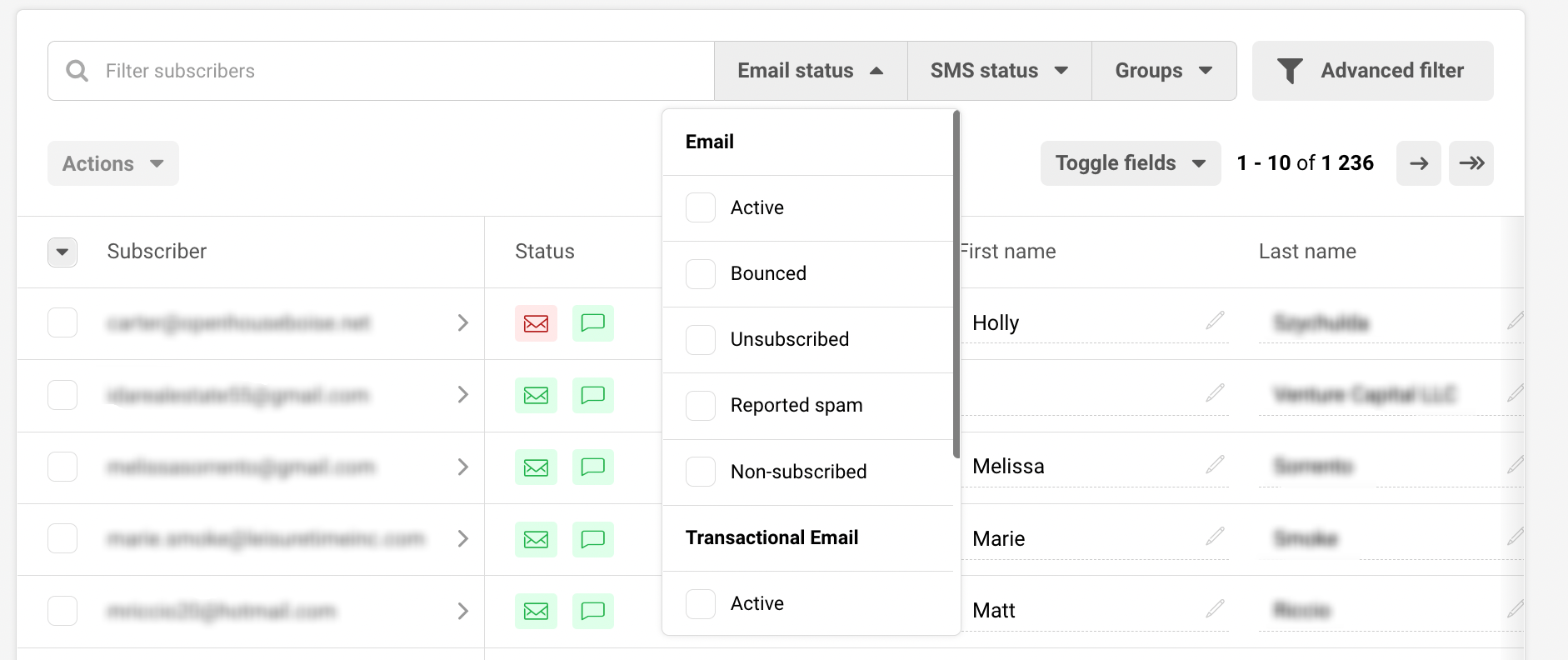 Subscribers will have status icons next to their email addresses. The envelop icon is for Email and Transactional email statuses, the talk bubble is for SMS and transactional SMS statuses.