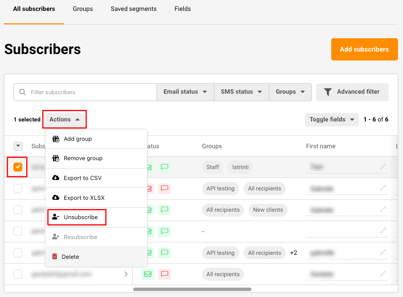 To remove a single subscriber, simply search their name in the search bar, tick the box next to their email address, click Actions -> Unsubscribe.