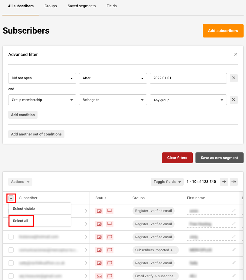 After selecting the proper conditions for your list, click the arrow and Select all the subscribers that got filtered out.